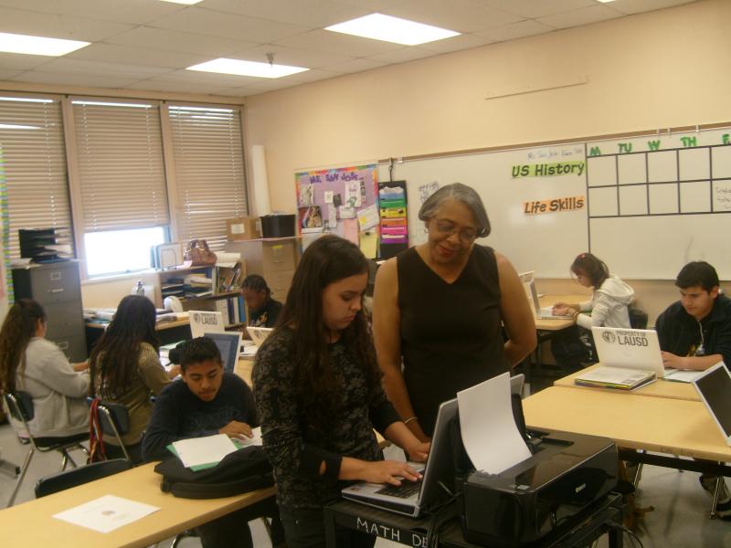 Dr. Dora Walker working in the classroom at Locke High School with students to develop their success plans